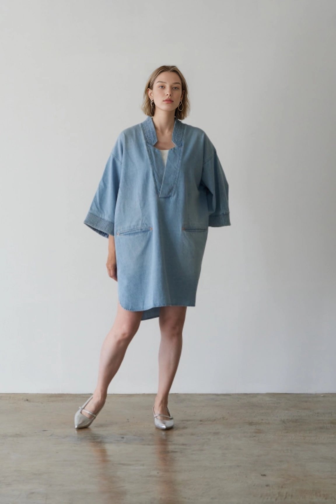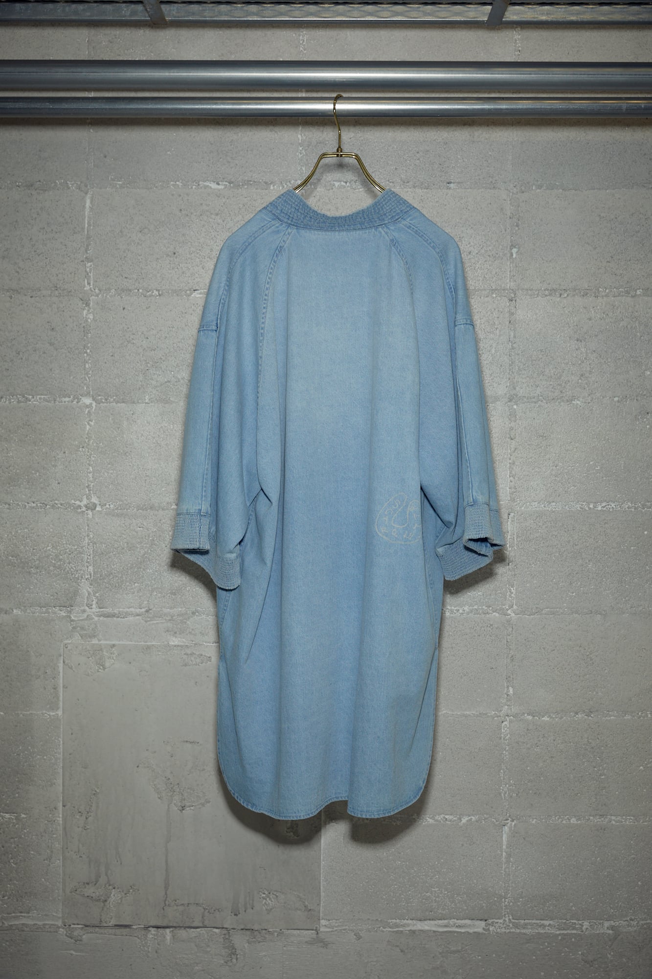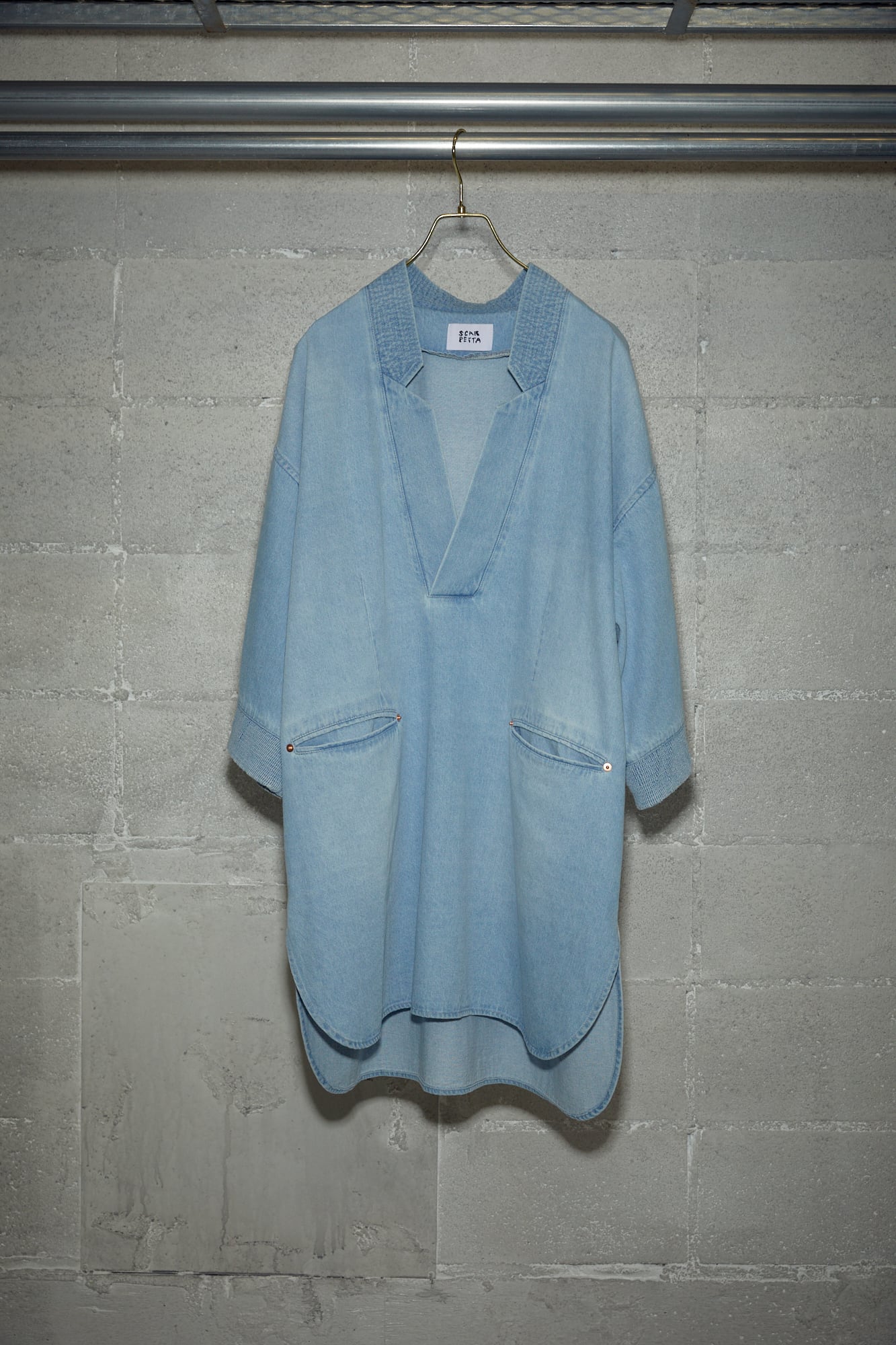 一枚でもサマになるプルオーバーのラペルチュニック。適度な張り感のある8.5ozデニムを採用。シャンブレーではなくあえてデニムで製作することで加工の奥行き感を出しました。スタンド型のラペルカラーにする事でカジュアルなイメージのあるデニムとの対比をデザインポイントに製作しました。袖先にゴムシャーリングを施すことでより立派的な加工感を出しました。一枚でサラリと着用しても、チュニック丈を活かしたレイヤードスタイルにもオススメです。