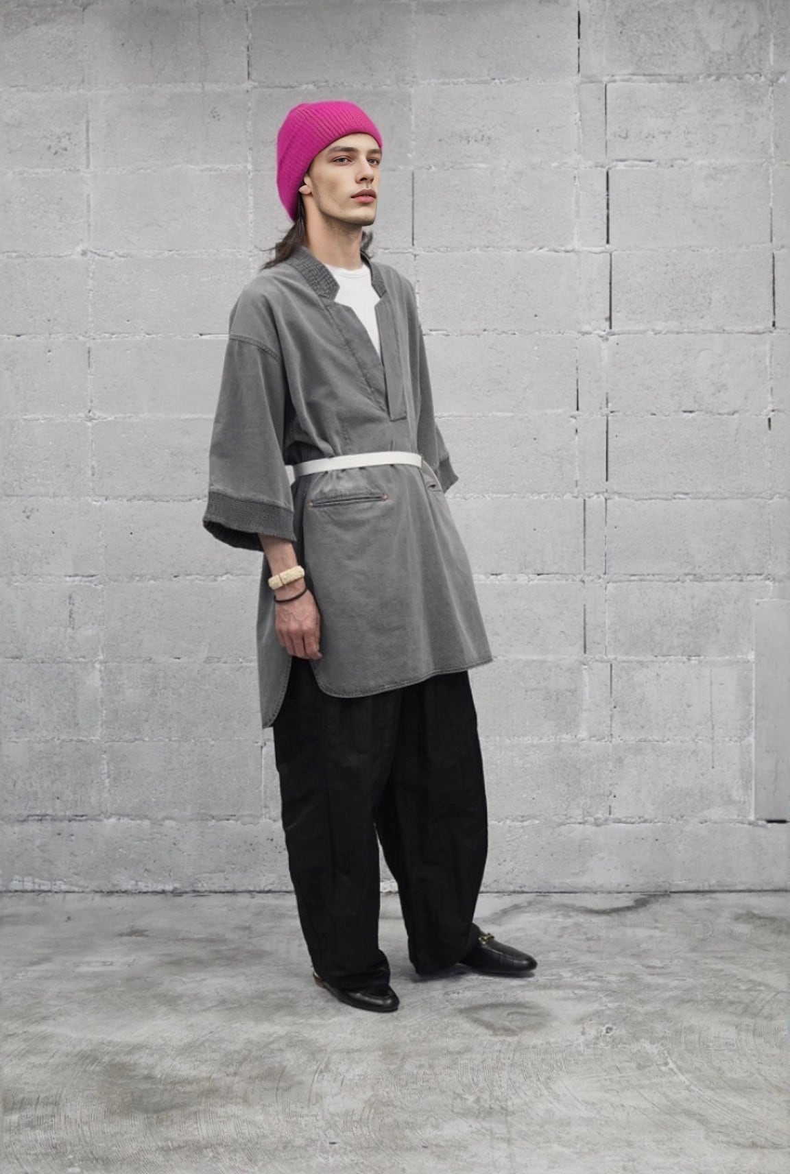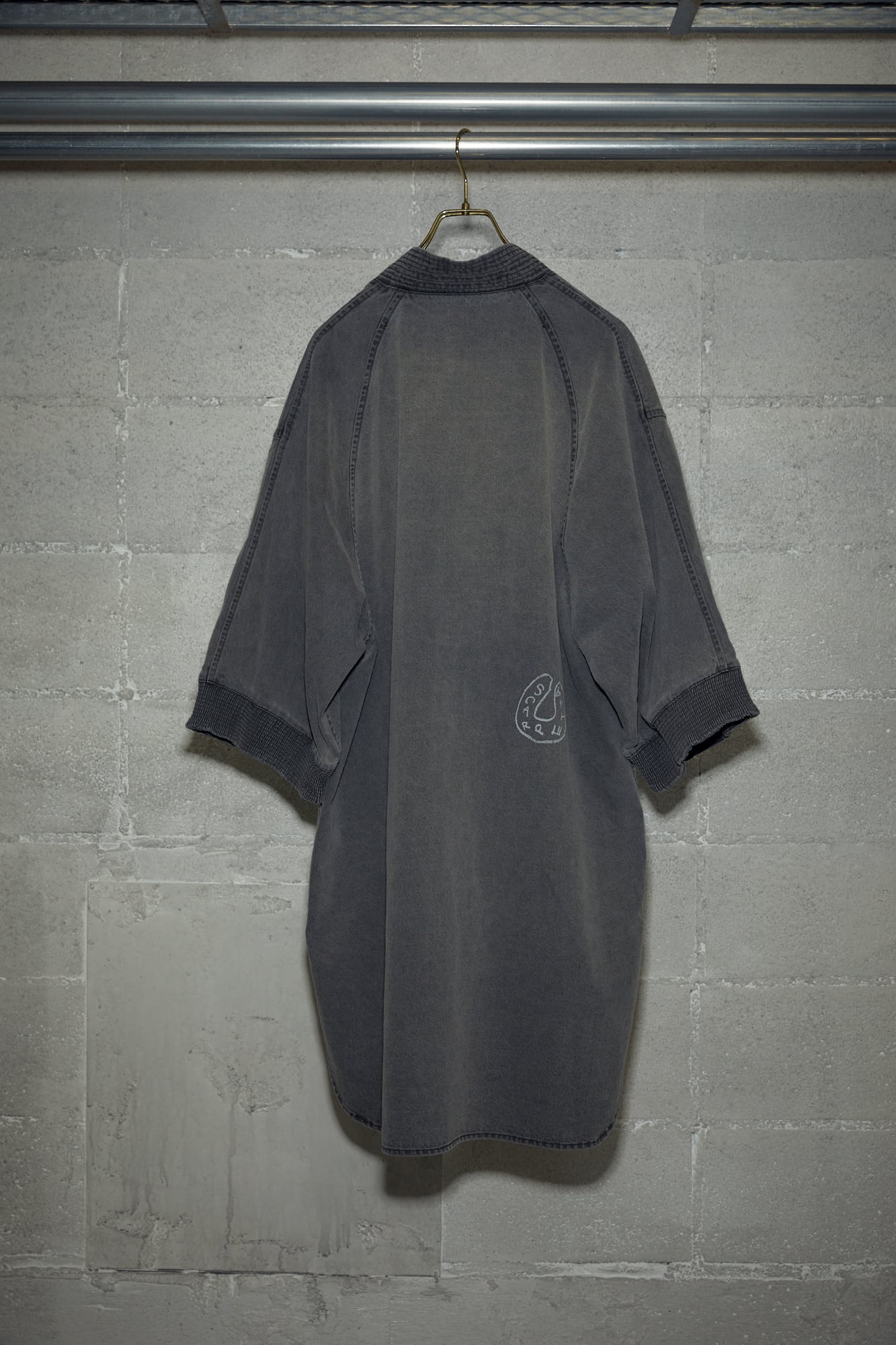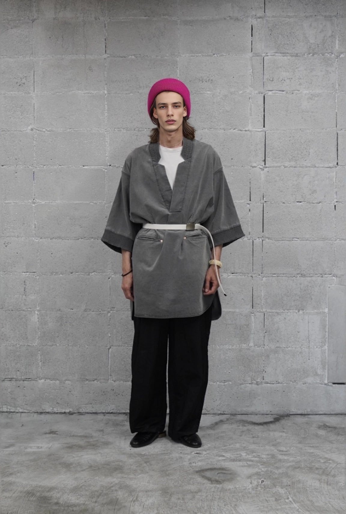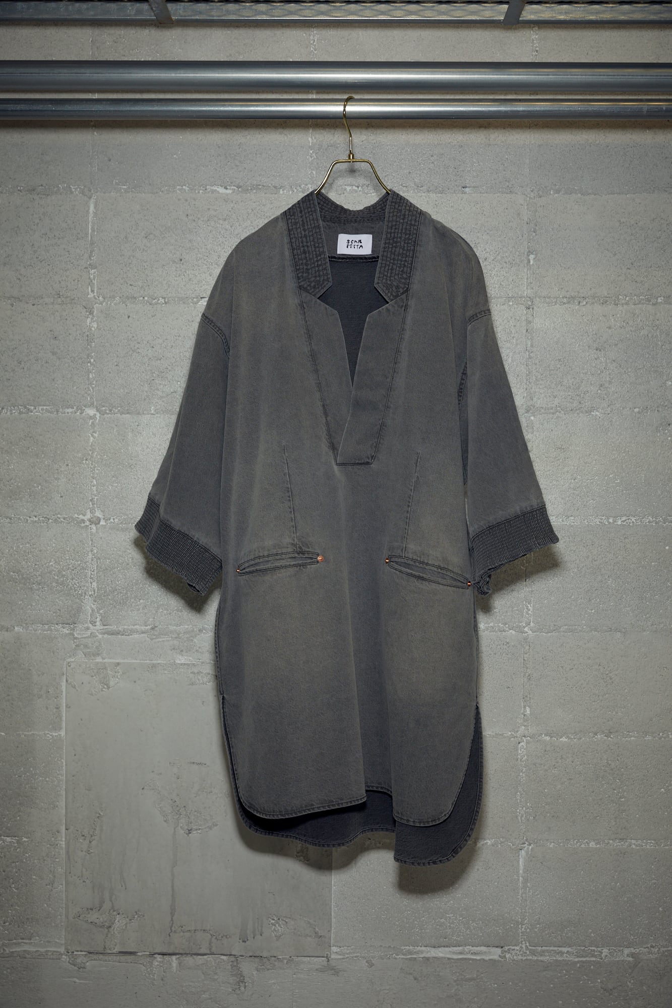 一枚でもサマになるプルオーバーのラペルチュニック。適度な張り感のある8.5ozデニムを採用。シャンブレーではなくあえてデニムで製作することで加工の奥行き感を出しました。スタンド型のラペルカラーにする事でカジュアルなイメージのあるデニムとの対比をデザインポイントに製作しました。袖先にゴムシャーリングを施すことでより立派的な加工感を出しました。一枚でサラリと着用しても、チュニック丈を活かしたレイヤードスタイルにもオススメです。