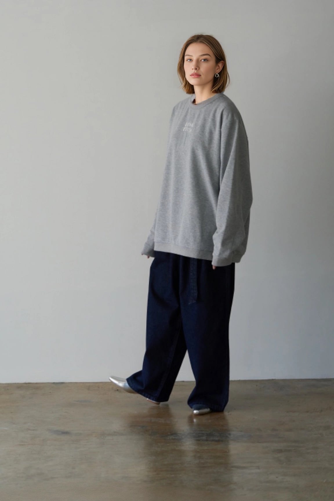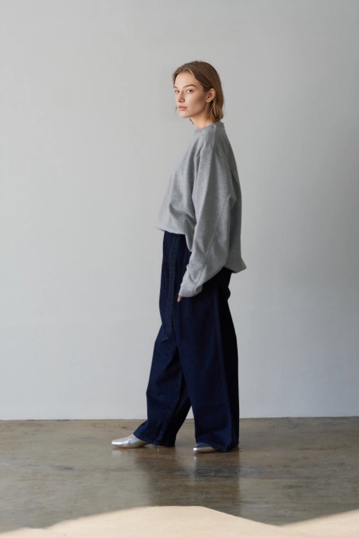 スラックスタイプの2タックパンツ。軽すぎず、重すぎないデイリーな着用にちょうど良い10ozデニムを採用しました。オールインワンの下部をデザインソースに、真っ直ぐストンの落ちるワイドシルエットに仕上げました。こちらはより大人が取り入れやすいワンウォッシュ加工。綺麗めなスタイリングにマッチするように仕上げました。