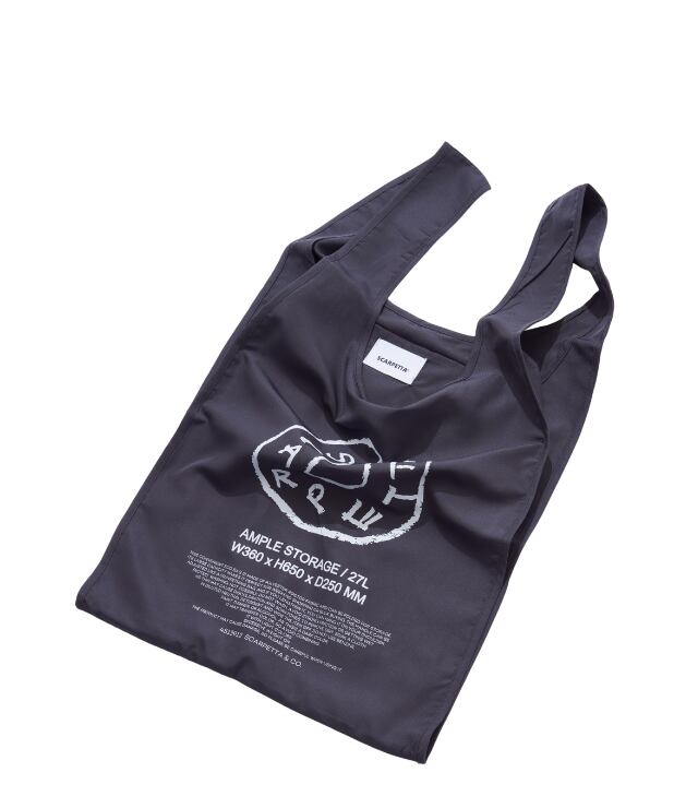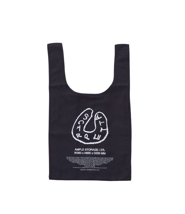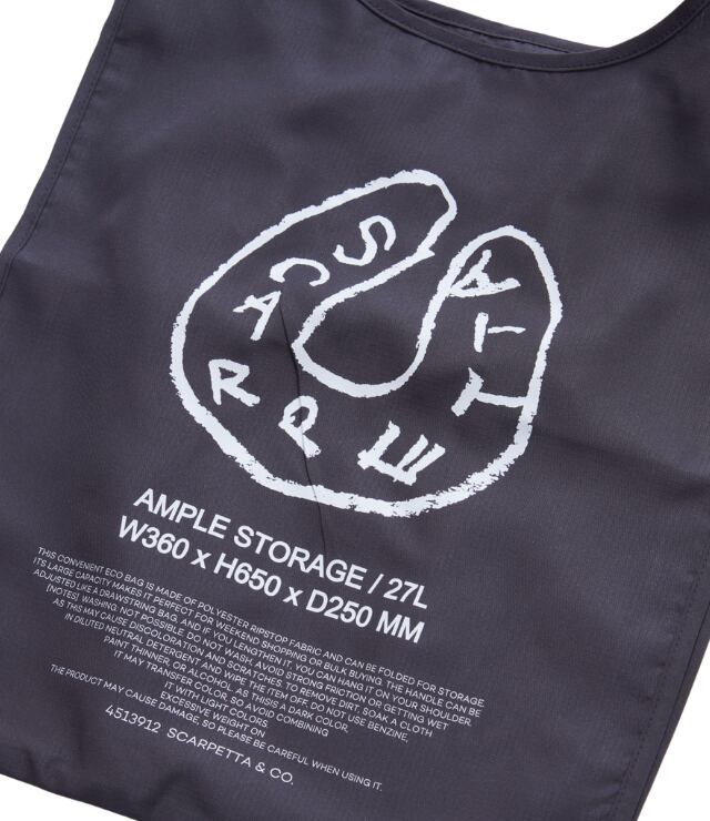 ポリエステルのリップストップ生地のECO BAG。 スカルペッタのグラフィックと商品情報をそのまま英語表記でプリント。 小さい文字をお皿に見えるような遊び心を入れました。