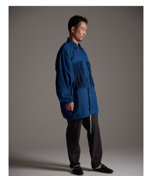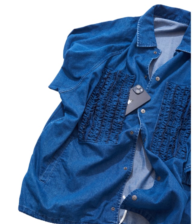 ワークシャツの胸ポケットをフリル状にすることでドレス要素を取り入れたストリートなアイテム。