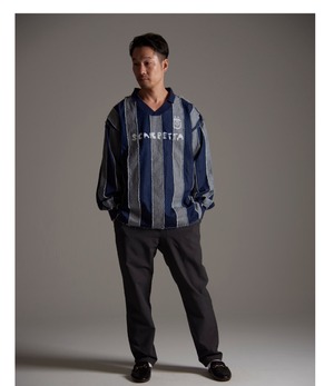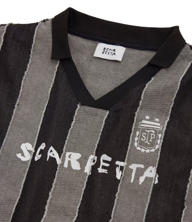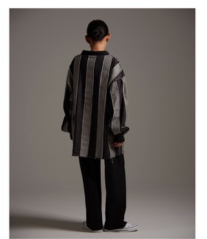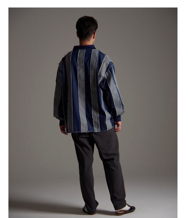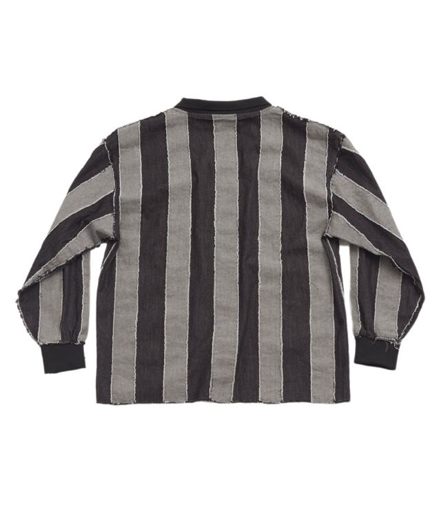 8ozデニム生地を使用したフットボールゲームシャツ。 ストライプ柄を生地の表裏で表現。断ち切りで縫い合わせることでより立体感のある表情に仕上げました。
