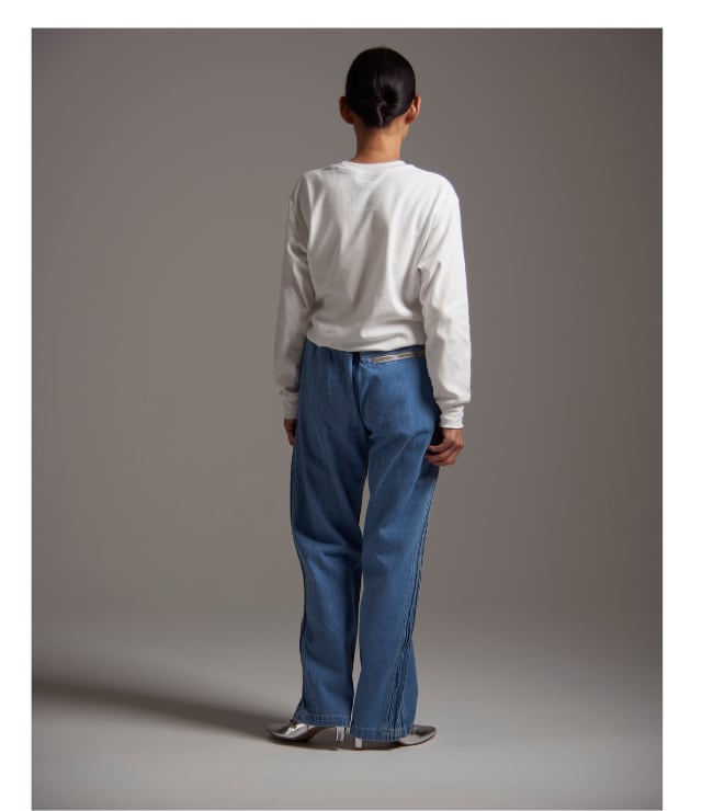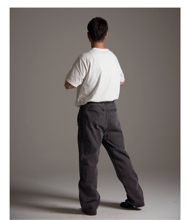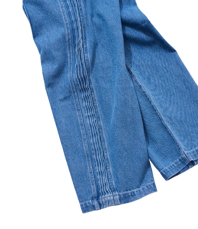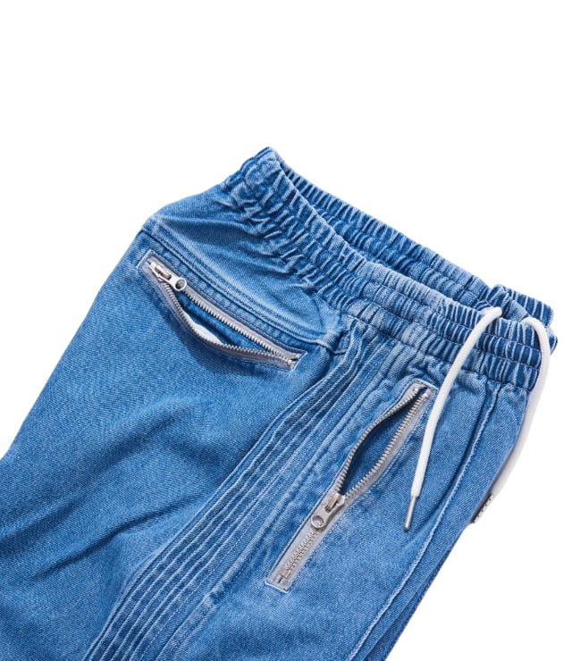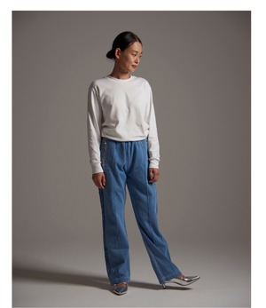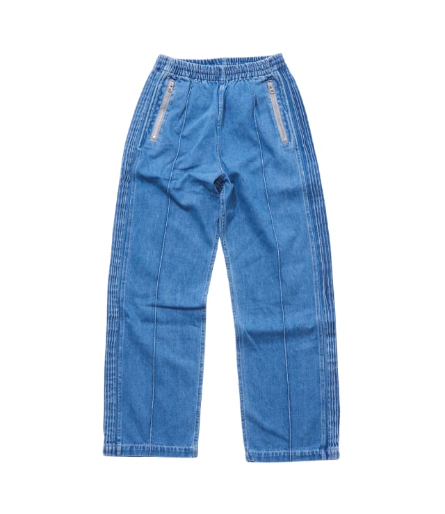 10OZデニム生地を使用したトラックパンツ。 脇のラインをタックで表現した立体的な見え方がポイント。同素材のブルゾンとセットアップ可能。